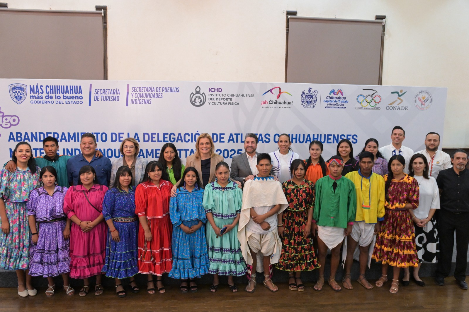 Chihuahua, Chih., a 6 de agosto del 2025.- La gobernadora María Eugenia Campos Galván abanderó a la delegación compuesta por 18 atletas rarámuris provenientes de la Sierra Tarahumara que participarán en la cuarta edición de los Juegos Maestros Indígenas 2025 que se llevará a cabo en Ottawa, Canadá.