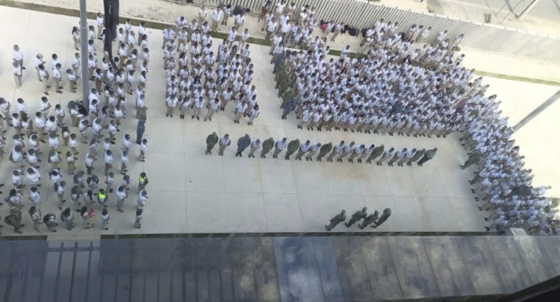 Al menos 415 trabajadores diariamente son obligados a rendir los honores a la bandera mexicana en el patio central de las instalaciones del corporativo del Tren Maya, ubicadas en Mérida, Yucatán.
