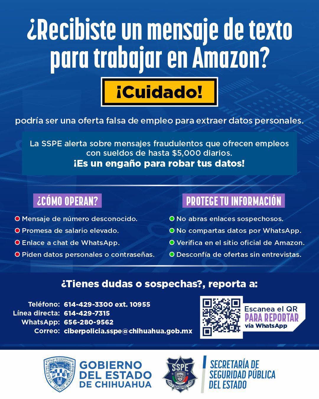 Ciudad Juárez, Chih.– La Secretaría de Seguridad Pública del Estado (SSPE) alertó a la ciudadanía sobre mensajes fraudulentos que circulan ofreciendo empleos en Amazon con sueldos de hasta 5 mil pesos diarios. Las autoridades señalaron que se trata de engaños diseñados para obtener datos personales de las personas.